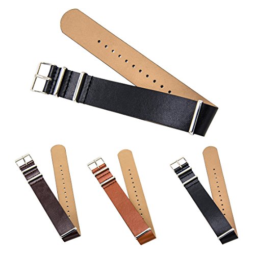 - UPGRADED PU LEATHER AND HARDWARE: Premium leather (waterproof, flexible, shiny), slim rectangular hardware (stainless steel) with polished, brushed, PVD, and gold finishes, stitched construction. Our CIVO NATO leather straps stand out from other regular watch straps on market due to higher quality leather material, hardware finish options, and stitched construction. Made of leather yet breathable, textured yet lightweight