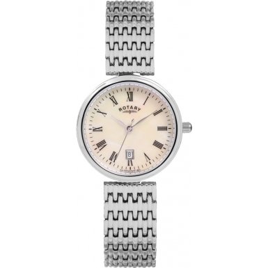A sleek and elegant wrist watch by Rotary , this is a high functioning watch which will serve you well for smart wear. This watch is the ideal gift for her. Product Features: * Quartz movement. * Mother of pearl dial. * Roman numerals. * Hour, minute and second hand. * Date/calendar. * All Stainless steel strap * Deployment fold over clasp. * Waterproof Strap Measurements: * Circumference of watch when worn: 18cm. This strap is adjustable, if taken to a qualified professional, 10 of the links can be removed, each measuring 0.7mm. Also Comes With: * Instructions. * Manufacturers guarantee. * Rotary presentation box.